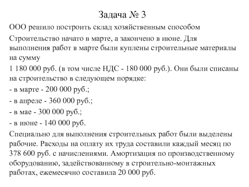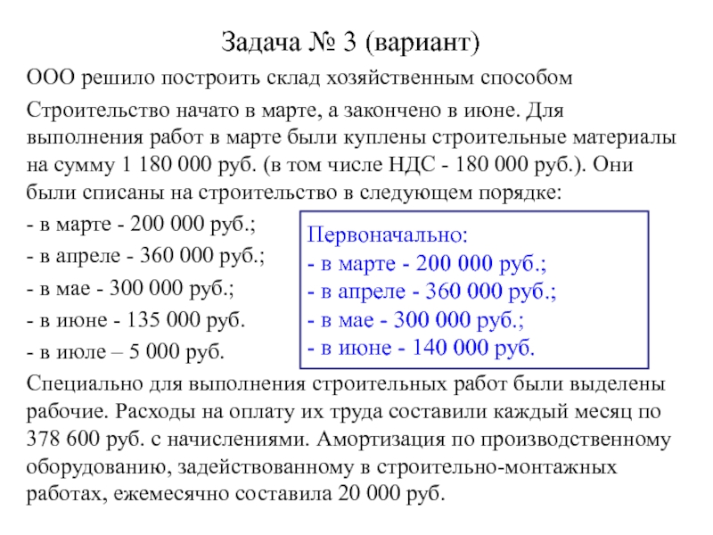 Специально для выполнения строительных работ были выделены рабочие. Расходы на оплату их труда составили каждый месяц по 378 600 руб. с начислениями. Амортизация по производственному оборудованию, задействованному в строительно-монтажных работах, ежемесячно составила 20 000 руб.