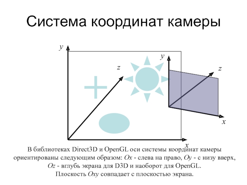- с низу вверх, Oz - вглубь экрана для D3D и наоборот для OpenGL.