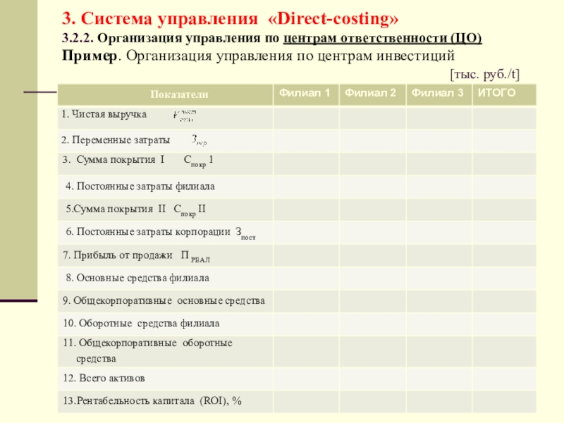 по каждому центру ответственности выделяются переменные (Зпер) и постоянные (Зпост) затраты;