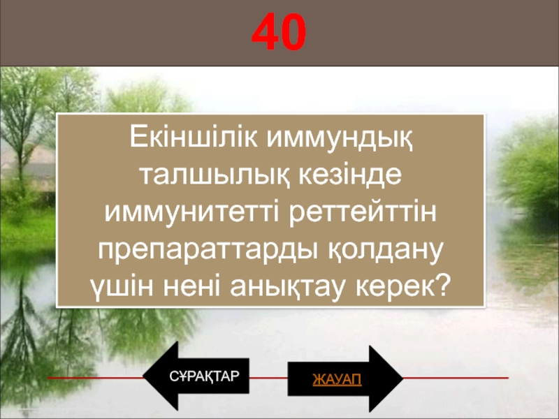 СҰРАҚТАР40ЖАУАПЕкіншілік иммундық талшылық кезінде иммунитетті реттейттін препараттарды қолдану үшін нені анықтау керек?