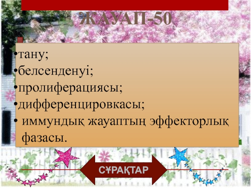 ЖАУАП-50СҰРАҚТАРтану;белсенденуі; пролиферациясы; дифференцировкасы; иммундық жауаптың эффекторлық фазасы.