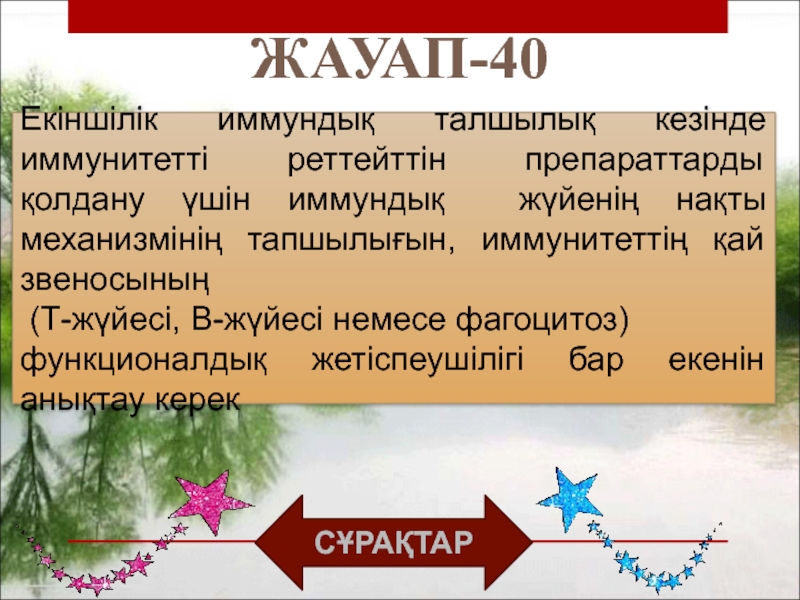 ЖАУАП-40СҰРАҚТАРЕкіншілік иммундық талшылық кезінде иммунитетті реттейттін препараттарды қолдану үшін иммундық жүйенің нақты механизмінің тапшылығын, иммунитеттің қай звеносының