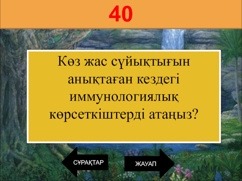 СҰРАҚТАР40ЖАУАПКөз жас сүйықтығын анықтаған кездегі иммунологиялық көрсеткіштерді атаңыз?