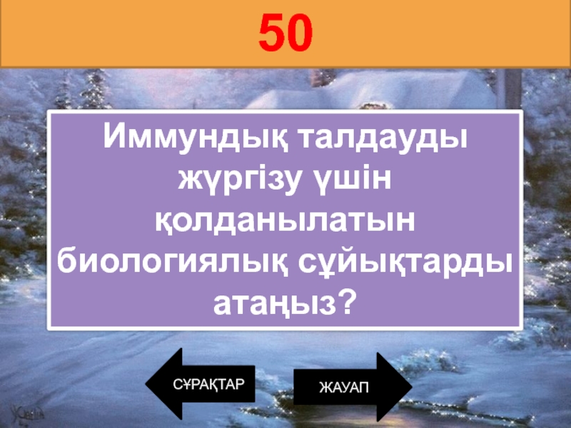 СҰРАҚТАР50ЖАУАПИммундық талдауды жүргізу үшін қолданылатын биологиялық сұйықтарды атаңыз?