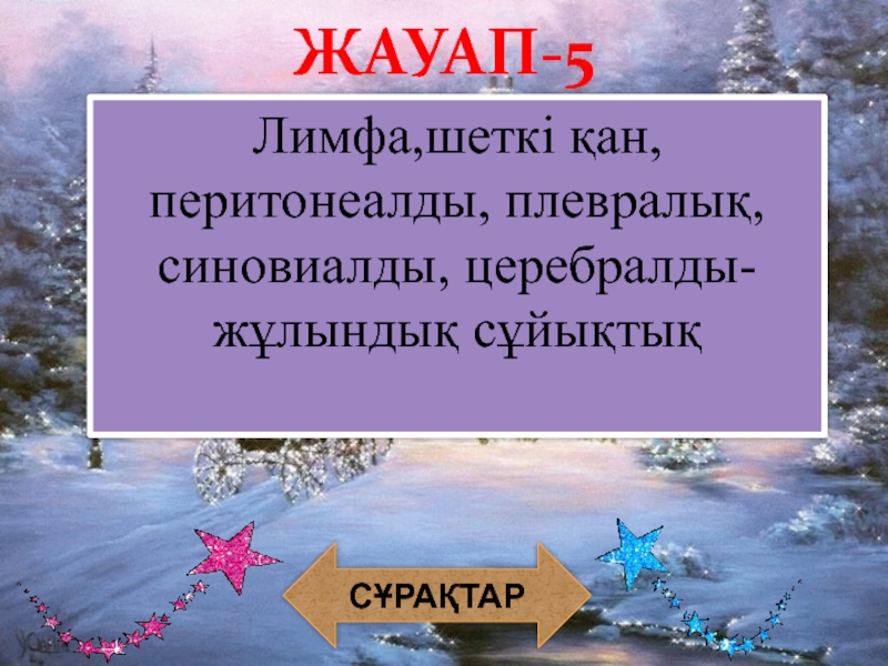 ЖАУАП-50СҰРАҚТАРЛимфа,шеткі қан, перитонеалды, плевралық, синовиалды, церебралды-жұлындық сұйықтық
