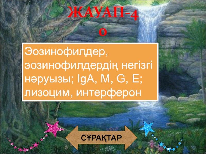 ЖАУАП-40СҰРАҚТАРЭозинофилдер, эозинофилдердің негізгі нәруызы; ІgА, М, G, Е; лизоцим, интерферон