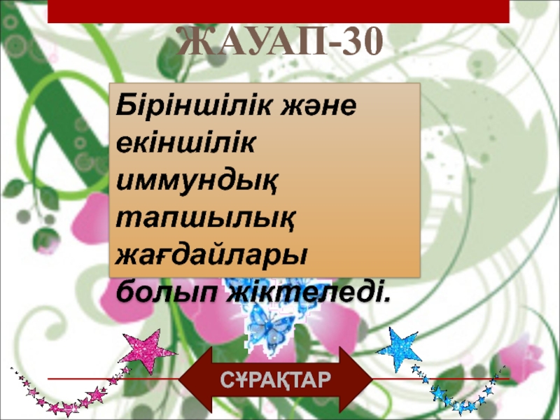 ЖАУАП-30СҰРАҚТАРБіріншілік және екіншілік иммундық тапшылық жағдайлары болып жіктеледі.