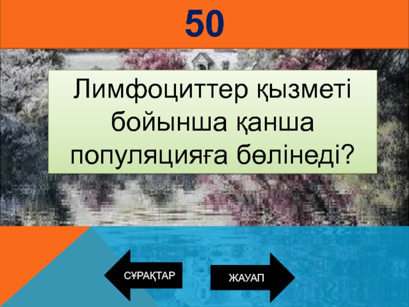СҰРАҚТАР50ЖАУАПЛимфоциттер қызметі бойынша қанша популяцияға бөлінеді?