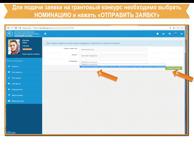 Для подачи заявки на грантовый конкурс необходимо выбрать НОМИНАЦИЮ