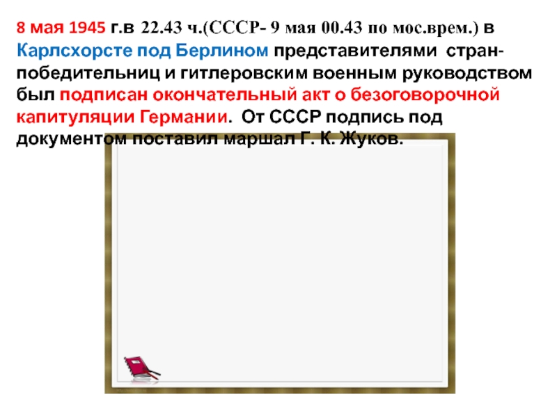 За две недели Советская армия под командованием маршала А.М. Василевского разгромила основные силы японцев. В ходе десантных операций были освобождены Южный Сахалин и Курильские острова.