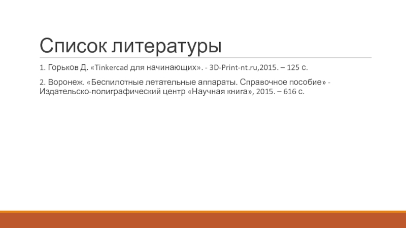 Список литературы1. Горьков Д. «Tinkercad для начинающих». - 3D-Print-nt.ru,2015. – 125 с.2. Воронеж. «Беспилотные летательные аппараты. Справочное