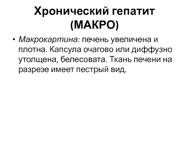 Макрокартина: печень увеличена и плотна. Капсула очагово или диффузно