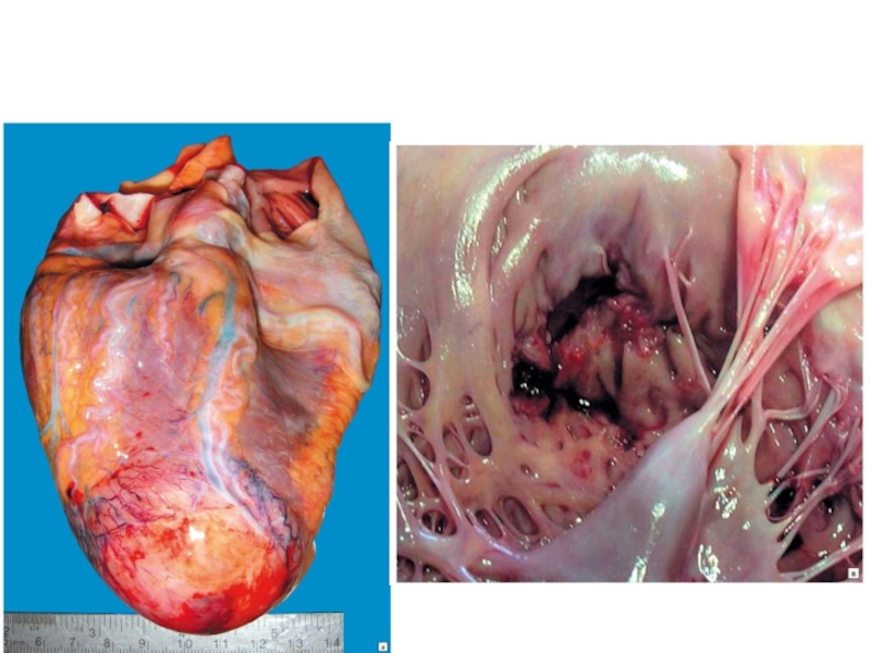 см, увеличен объем сосочковых и трабекулярных мышц, расширены полости сердца, миокард дряблой консистенции, глинистого вида на разрезе (эксцентрическая гипертрофия). В стенке миокарда левого желудочка крупный трансмуральный рубец неправильной геометрической формы, белого цвета, плотной консистенци