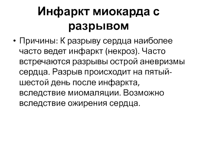 инфаркт (некроз). Часто встречаются разрывы острой аневризмы сердца. Разрыв происходит