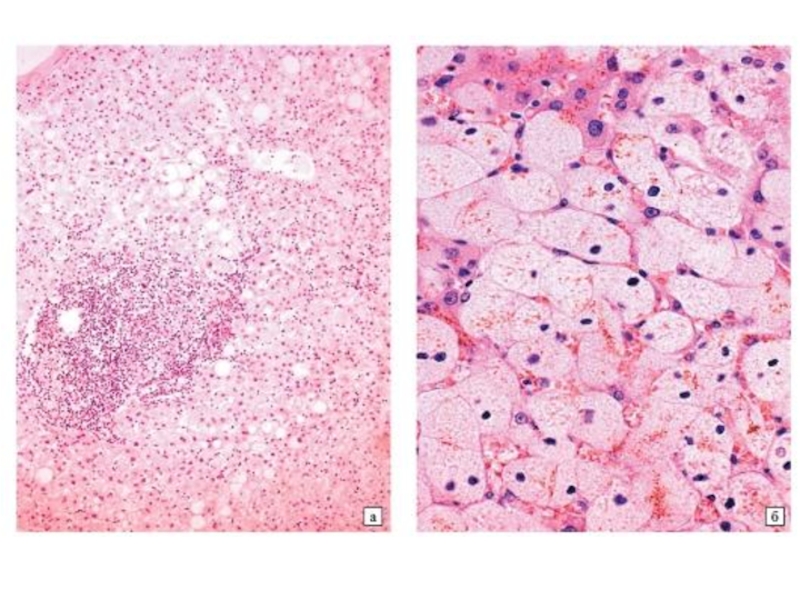 поле зрения (феномен сближения триад). Ложные дольки состоят из новообразованной печеночной ткани, могут встречаться многоядерные печеночные клетки. Для гепатоцитов характерны белковые дистрофии, липиды в них обычно не выявляются. Отмечается холестаз, пролиферация холангиол, лимфо-гистиоцитарная инфильтрация портальных трактов.