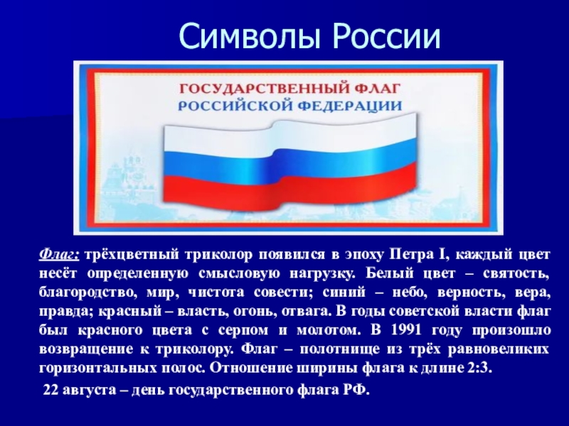 мир, чистота совести; синий – небо, верность, вера, правда; красный – власть, огонь, отвага. В годы советской власти флаг был красного цвета с серпом и молотом. В 1991 году произошло возвращение к триколору. Флаг – полотнище из трёх равновеликих горизонтальных полос. Отношение ширины флага к длине 2:3.
