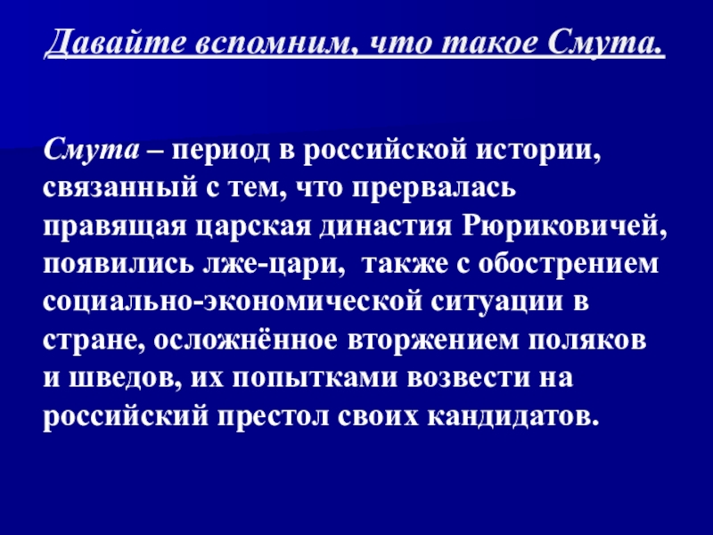 лже-цари, также с обострением социально-экономической ситуации в стране, осложнённое вторжением поляков и шведов, их попытками возвести на российский престол своих кандидатов.