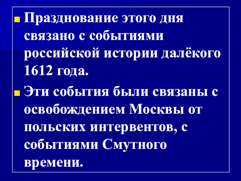 Слайд 2Празднование этого дня связано с событиями российской истории далёкого 1612