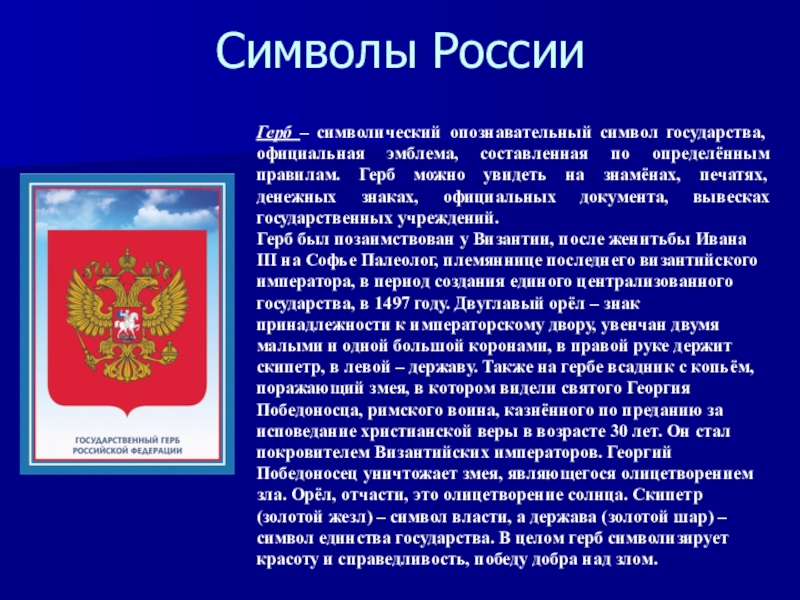 Герб был позаимствован у Византии, после женитьбы Ивана III на Софье Палеолог, племяннице последнего византийского императора, в период создания единого централизованного государства, в 1497 году. Двуглавый орёл – знак принадлежности к императорскому двору, увенчан двумя малыми и одной большой коронами, в правой руке держит скипетр, в левой – державу. Также на гербе всадник с копьём, поражающий змея, в котором видели святого Георгия Победоносца, римского воина, казнённого по преданию за исповедание христианской веры в возрасте 30 лет. Он стал покровителем Византийских императоров. Георгий Победоносец уничтожает змея, являющегося олицетворением зла. Орёл, отчасти, это олицетворение солнца. Скипетр (золотой жезл) – символ власти, а держава (золотой шар) – символ единства государства. В целом герб символизирует красоту и справедливость, победу добра над злом.