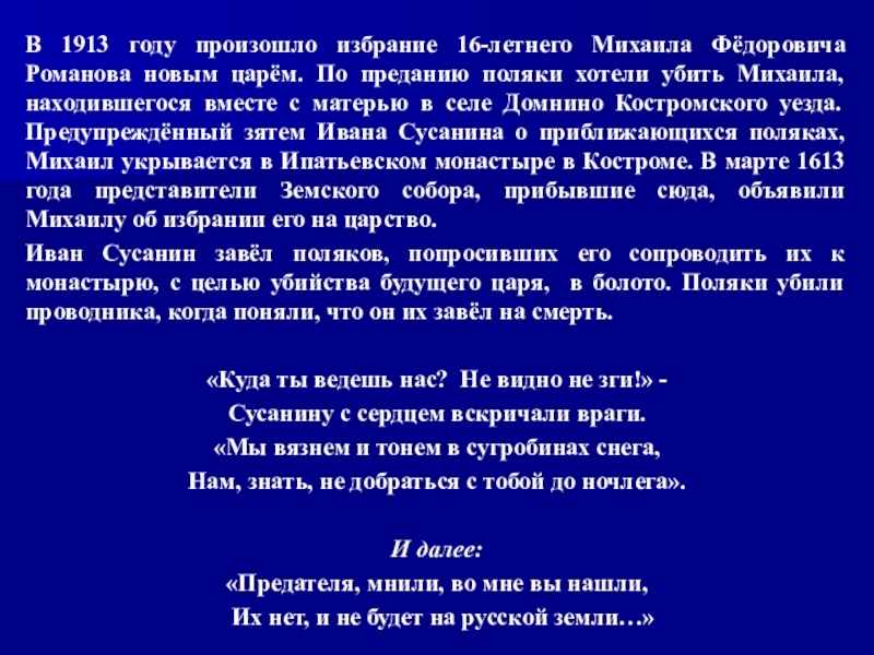 Иван Сусанин завёл поляков, попросивших его сопроводить их к монастырю, с целью убийства будущего царя, в болото. Поляки убили проводника, когда поняли, что он их завёл на смерть.