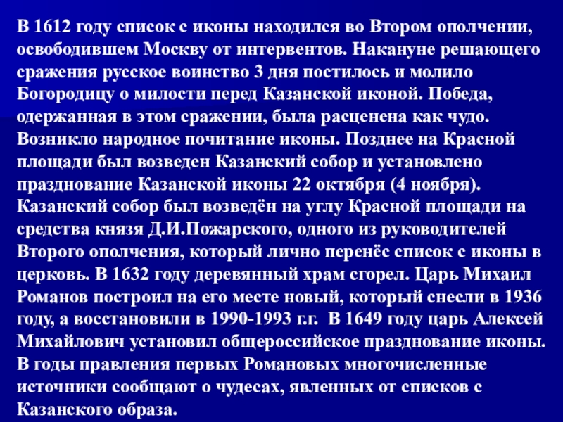 дня постилось и молило Богородицу о милости перед Казанской иконой. Победа, одержанная в этом сражении, была расценена как чудо. Возникло народное почитание иконы. Позднее на Красной площади был возведен Казанский собор и установлено празднование Казанской иконы 22 октября (4 ноября). Казанский собор был возведён на углу Красной площади на средства князя Д.И.Пожарского, одного из руководителей Второго ополчения, который лично перенёс список с иконы в церковь. В 1632 году деревянный храм сгорел. Царь Михаил Романов построил на его месте новый, который снесли в 1936 году, а восстановили в 1990-1993 г.г. В 1649 году царь Алексей Михайлович установил общероссийское празднование иконы. В годы правления первых Романовых многочисленные источники сообщают о чудесах, явленных от списков с Казанского образа.