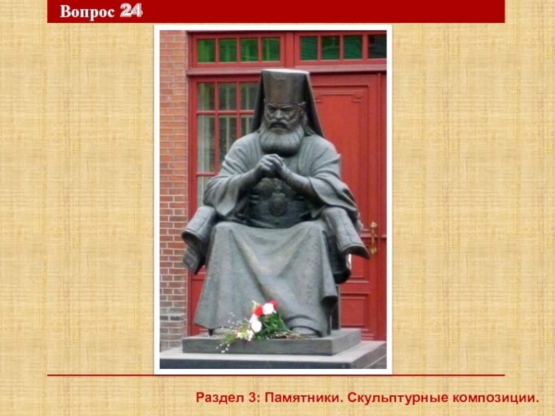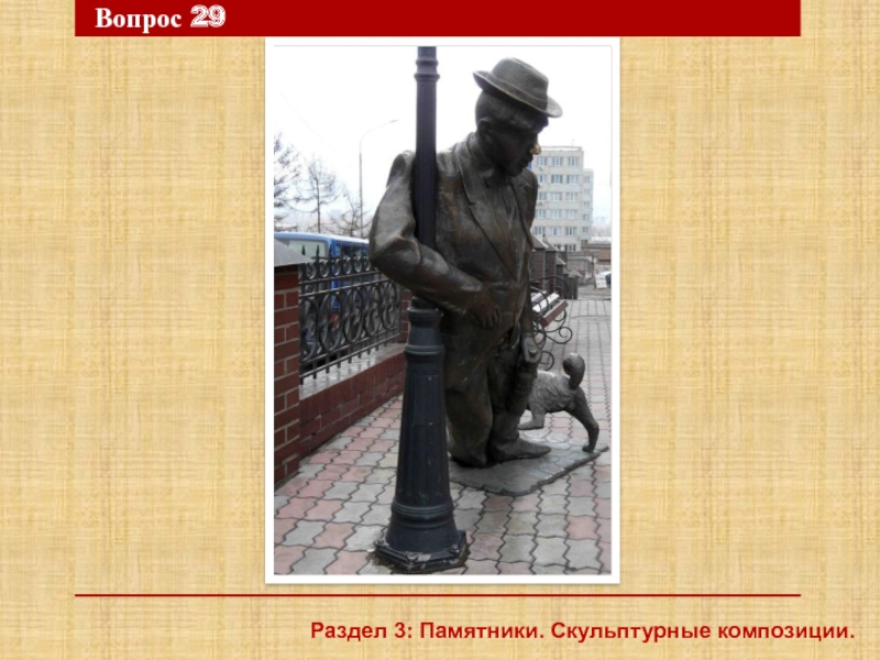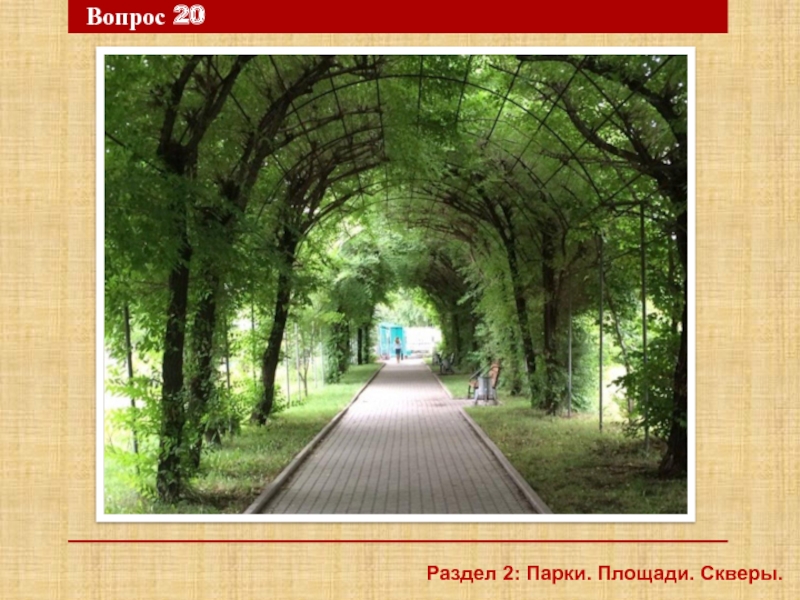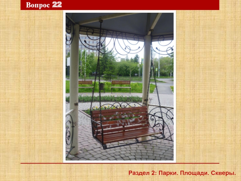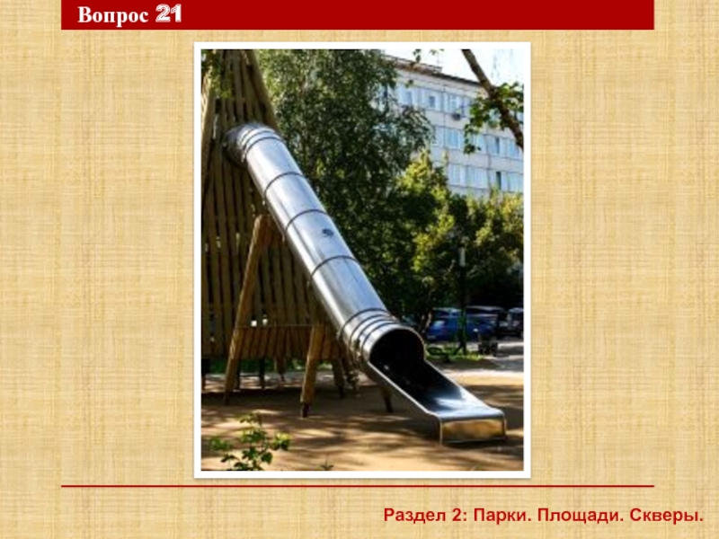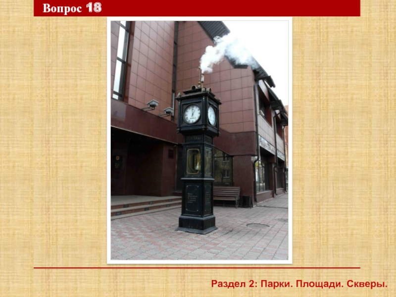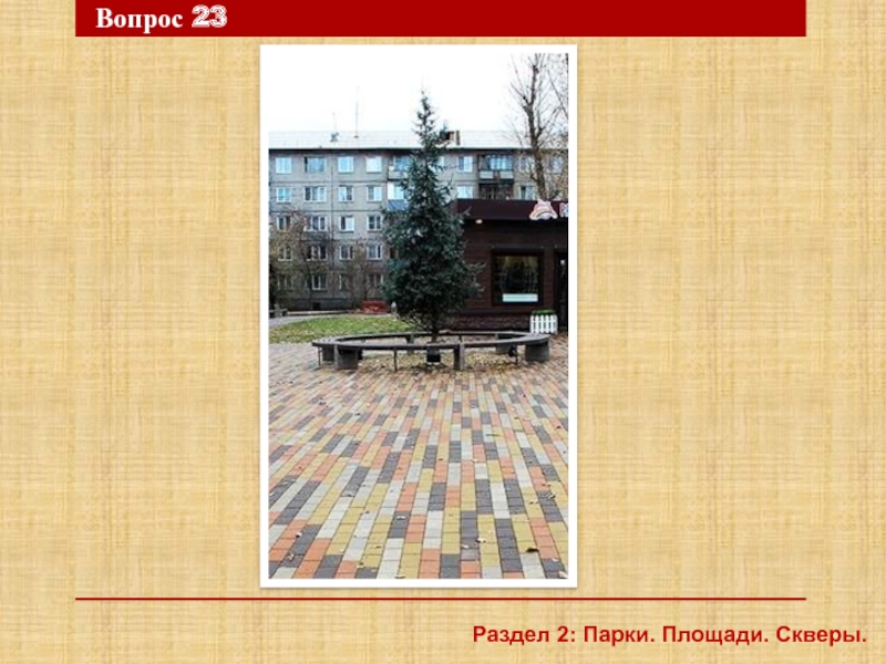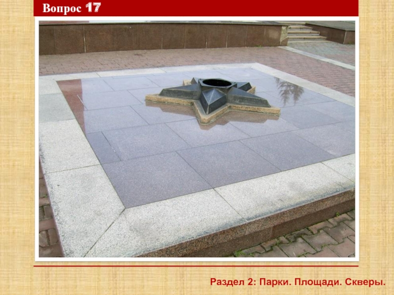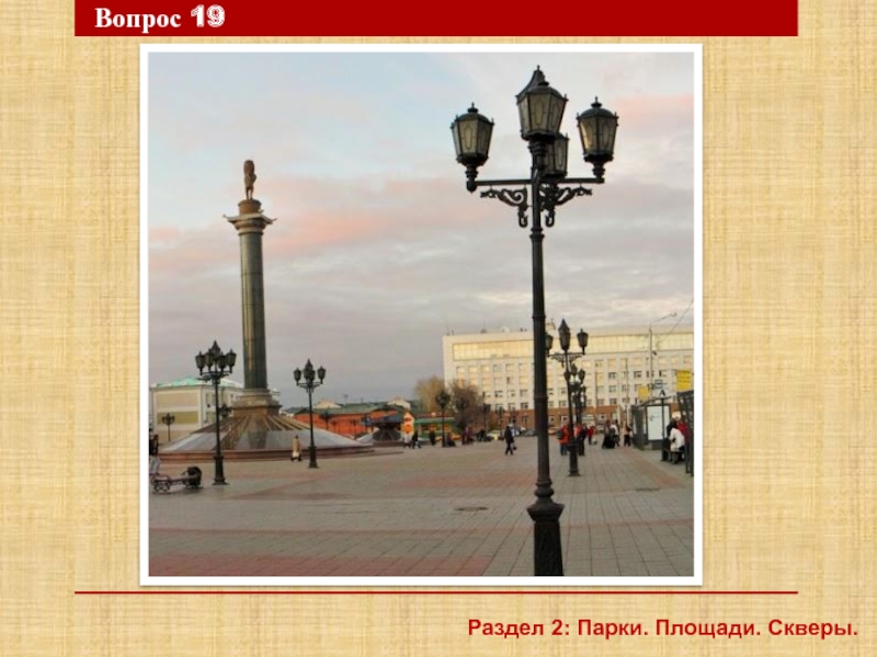 на слайде, его адрес.При ответе на вопросы раздела 2 – назвать парк, площадь или сквер, уголок которой (-ого) представлен на фотографии.