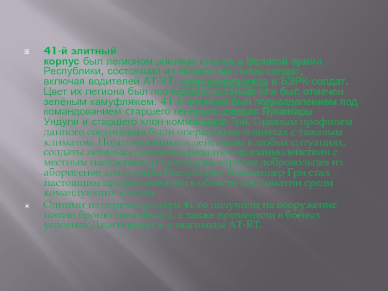 зелёным камуфляжем. 41-й элитный был подразделением под командованием cтаршего генерала-джедая Луминары Ундули и старшего клон-коммандера Гри. Главным профилем данного соединения были операции на планетах с тяжелым климатом. Подготовленные к действиям в любых ситуациях, солдаты легиона специализировались на взаимодействии с местным населением и подготовке отрядов добровольцев из аборигенов для службы Республике. Коммандер Гри стал настоящим профессионалом в области дипломатии среди командующих клонов.