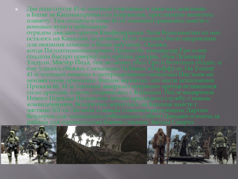 вместе с воинами вуки и небольшим отрядом джедаев против Конфедерации. Хотя большинство из них осталось на Кашиике, отделение 41-го элитного было направлено для оказания помощи в битве наУтапау. Однако, когда Палпатининициировал Приказ 66, коммандер Гри и его солдаты быстро повернулись против джедаев, убив Луминару Ундули. Мастер Йода, тем не менее, убил Гри и болотных солдат, и ему удалось сбежать с помощью Чубакки иТарффула. На Утапау 41-й элитный помогал в интернировании несколько Пау'анов по неизвестным причинам. Вполне вероятно, что после исполнения Приказа 66, 41-й элитный завершил операции против оставшихся силы дроидов, а затем отправились с Кашиика. После воцарения Нового Порядка Палпатина легион продолжил службу с новым командованием. Вскоре они вернулись на Кашиик вместе с частями 501-го Легиона и новым главнокомандующим Дартом Вейдером для ликвидации избежавших гибели Джедаев и охоты за рабами для строительства боевой станции Звезды Смерти.