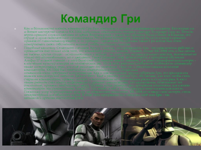 Подобные капитану Сенатского спецназа Аргусу считали, что преданность Гри - это практически рабство, и проявляется оно только из-за того, что коммандер родился клоном. Однако, солдат КК-1004 хоть и был похож на тысячи других солдат - исполнительных и верных - он имел свои индивидуальные свойства, замеченные не только его подчинёнными, но и джедаями. Также развивал свою независимость в программе обучения Альфы-17 и самое главное - у него было своё собственное имя.И, наконец, Гри имел специфический интерес - к изучению культур и миров не-человеческих рас. Из-за этой довольно необычной особенности коммандер также интересовался теми, кто ещё разделяет его увлечение. Имел он и неплохие навыки во взломе компьютеров. КК-1004 был генетически изменённым клоном, созданным покаминоанской программе клонирования. Как и для миллионов других собратьев Гри, его оригиналом являлся мандалорский наёмник Джанго Фетт. Ещё в раннем детстве Гри, обучаемый для того, чтобы стать старшим коммандером, проявил интерес к экзотическим не-человеческим расам и их культурам. Клон с таким рвением стал искать информацию о древних цивилизациях, что каминоанцы, отметившие это отклонение, приняли необходимые меры. Однако, когда развернулась программа подготовки для клонов-коммандеров под руководством Альфа-17, Гри вошёл в неё и только раскрыл свою индивидуальность. Поскольку упор в тренировках делался на независимое мышление, КК-1004 не оставил свой интерес, столь нехарактерный для обычного клона. В ходе этой программы он и получил своё имя Гри - так называлась древняя мистическая раса.