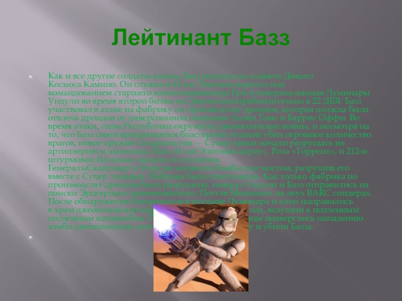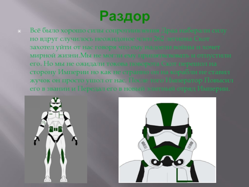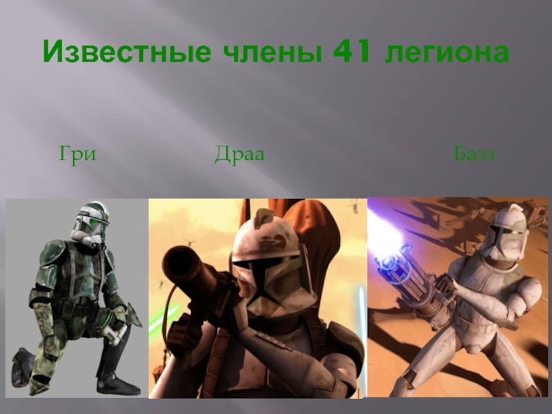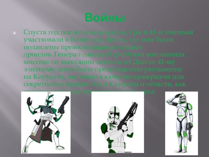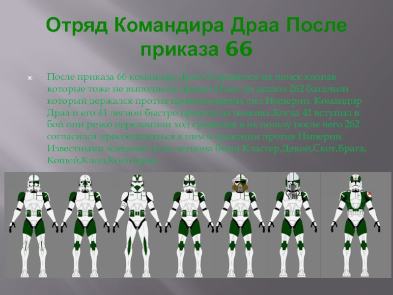 Слайд 241-й элитный корпус был легионом элитных клонов в Великой армии Республики, состоящий из множества типов солдат, включая водителей