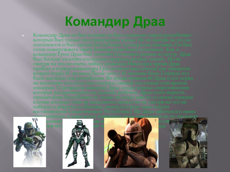 на это он подчинялся и был предан республике и генералам джедаям. Он был готов пожертвовать своей жизнью ради блага остольных. Как и командир Грии Драа был увличён изучением разных культур. Драа был больше увличён изучением природы разных планет. Но не смотря на это он очень любил сражения.Некоторое время Драа пробыл в отряде командира Гри но несколько погодя ему доверили второй отряд 41 легиона.После чего у 41 легиона было 2 отряда что было выгодно для республики. Во время приказа 66 Драа и его отряд не выполнил его отпустив генерала джедая тем самым став врагом империи. Став врагом империи Драа создал войска сопротивления которые расположились на дальних рубежах. Драа хотел вернуть процветание Республики по этому он искал вместе со своим отрядом клонав которые тоже не выполнели приказ но не смотря на это он наберал в рекруты и обычных людей которые тоже хотели востоновление Галактической Республики. Но Драа заботился о своих подчинённых и даже когда появились силы повстанцев он не рисковал пресоединяться к ним думав если они вступят с ними в союз то империя их просто раздавит численным преимуществам.