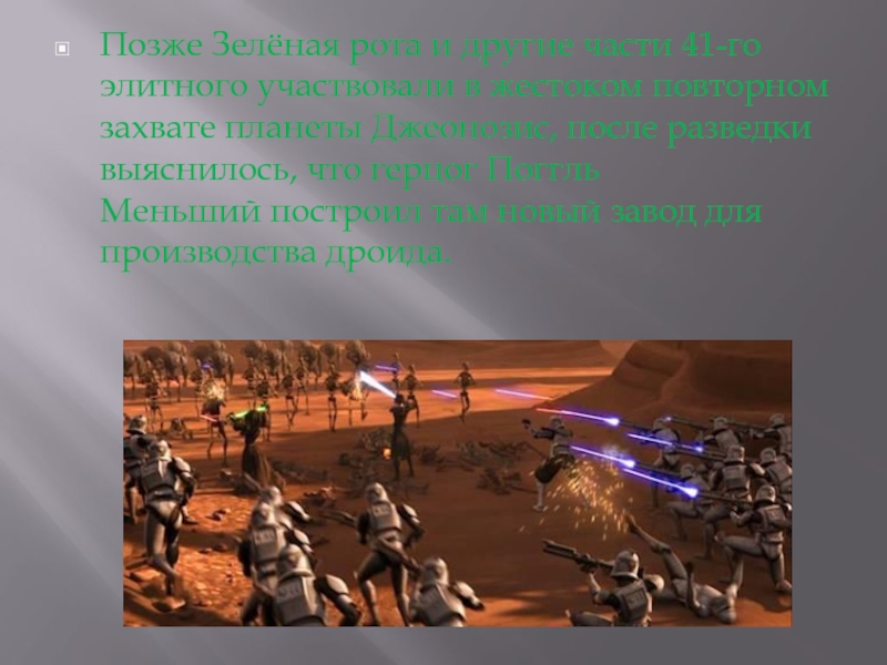 Слайд 7Позже Зелёная рота и другие части 41-го элитного участвовали в жестоком повторном захвате планеты Джеонозис,