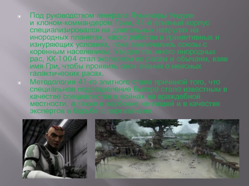 Слайд 3Под руководством генерала Луминары Ундули и клоном-коммандером Грии, 41-й элитный корпус специализировался