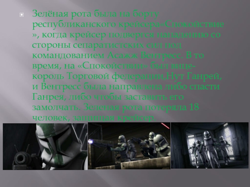 Слайд 6Зелёная рота была на борту республиканского крейсера«Спокойствие», когда крейсер подвергся нападению со
