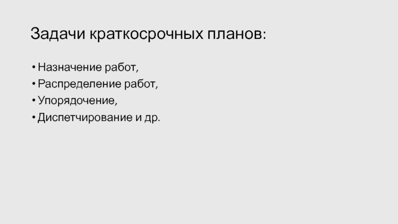 Задачи краткосрочных планов:Назначение работ,Распределение работ,Упорядочение,Диспетчирование и др.
