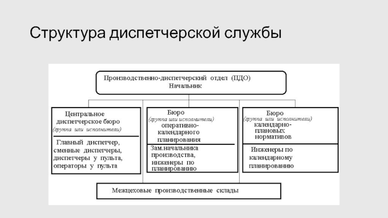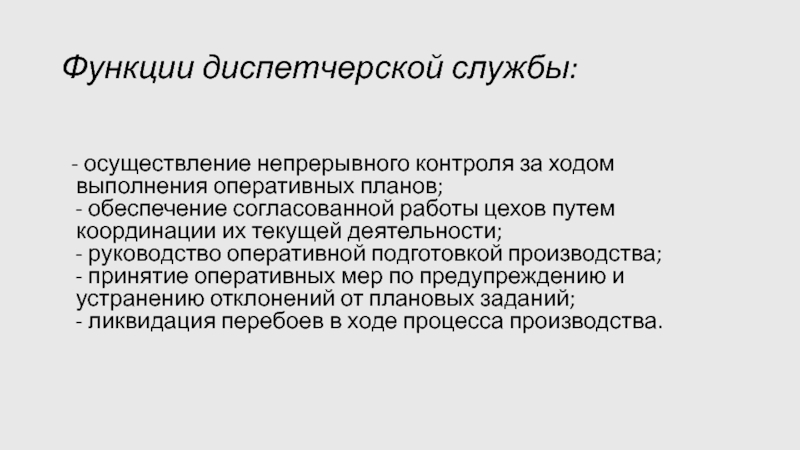 Функции диспетчерской службы: - осуществление непрерывного контроля за ходом выполнения оперативных планов; - обеспечение согласованной работы цехов