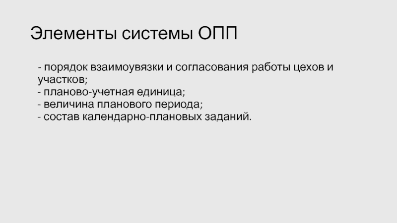 Элементы системы ОПП   - порядок взаимоувязки и согласования работы цехов и участков; - планово-учетная единица; -