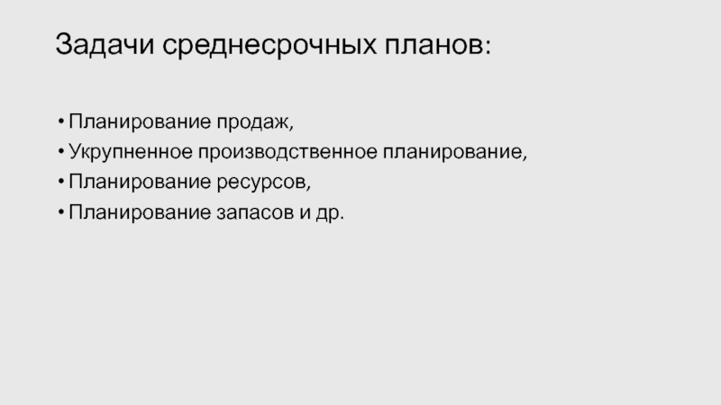 Задачи среднесрочных планов: Планирование продаж,Укрупненное производственное планирование,Планирование ресурсов,Планирование запасов и др.