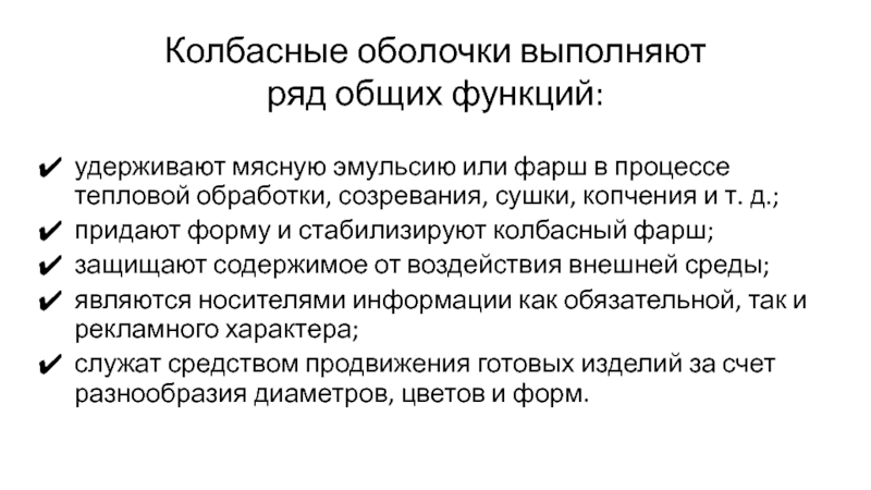 Слайд 7Колбасные оболочки выполняют ряд общих функций: