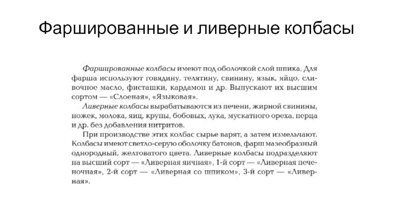 колбас и мясных хлебов 1 и 2-го сортов, сосисок и сарделек – не более 2 суток, мясных хлебов и колбас высшего сорта – до 3 суток. Вареные колбасы в мелкой фасовке, упакованные под вакуумом в полимерные пленки, хранят не более 24 ч. Срок хранения паштетов штучных не более 48 ч, а весовых – 24 ч, мороженых паштетов, хранящихся при температуре не выше -8°С – до 1 мес., ливерных колбас, зельцев и студней 3-го сорта – до 12 ч, полукопченых и варено-копченых колбас – до 10 суток, сырокопченых колбас – до 30 суток