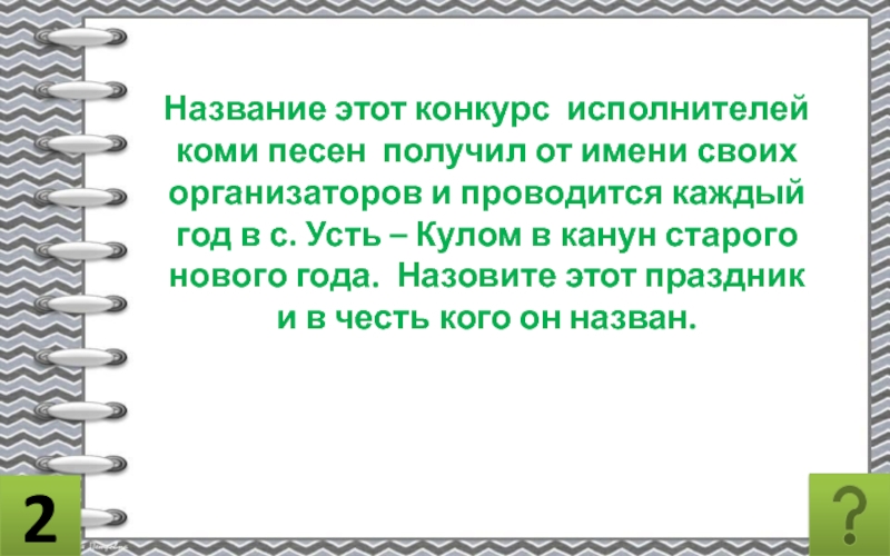 2Название этот конкурс исполнителей коми песен получил от имени своих организаторов и проводится каждый год в с.