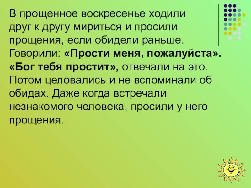 В прощенное воскресенье ходили друг к другу мириться и просили прощения, если обидели раньше.Говорили: «Прости меня, пожалуйста».«Бог
