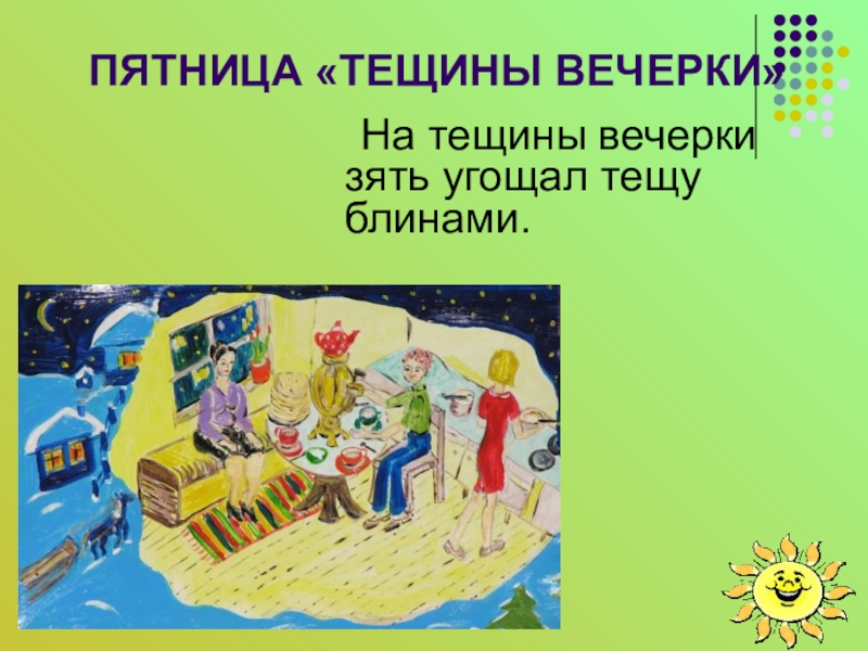 ПЯТНИЦА «ТЕЩИНЫ ВЕЧЕРКИ»  На тещины вечерки зять угощал тещу блинами.