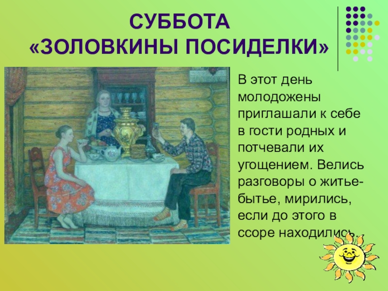 СУББОТА «ЗОЛОВКИНЫ ПОСИДЕЛКИ»В этот день молодожены приглашали к себе в гости родных и потчевали их угощением. Велись
