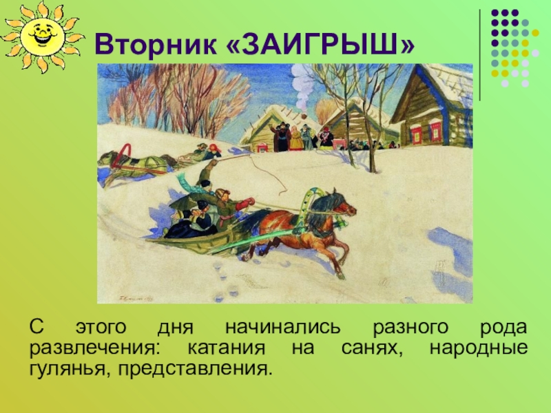 Вторник «ЗАИГРЫШ»С этого дня начинались разного рода развлечения: катания на санях, народные гулянья, представления.