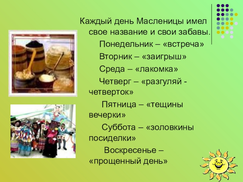 Слайд 9Каждый день Масленицы имел свое название и свои забавы.