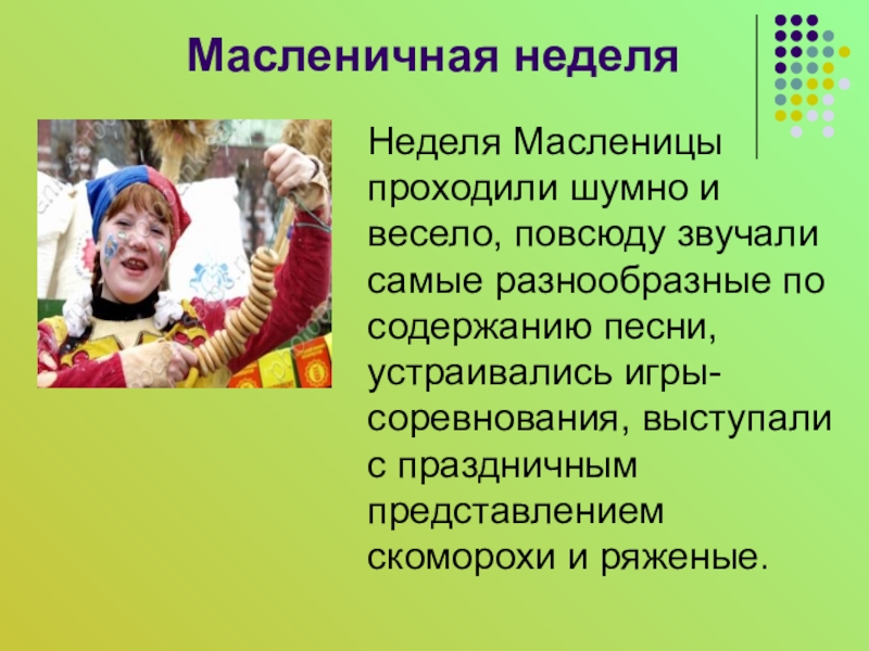 Масленичная неделяНеделя Масленицы проходили шумно и весело, повсюду звучали самые разнообразные по содержанию песни, устраивались игры-соревнования, выступали