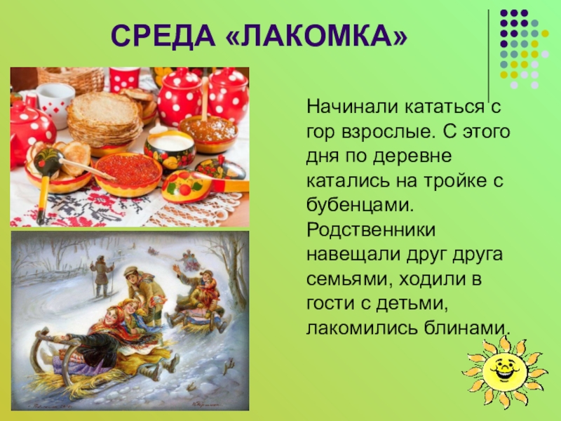 СРЕДА «ЛАКОМКА»Начинали кататься с гор взрослые. С этого дня по деревне катались на тройке с бубенцами. Родственники