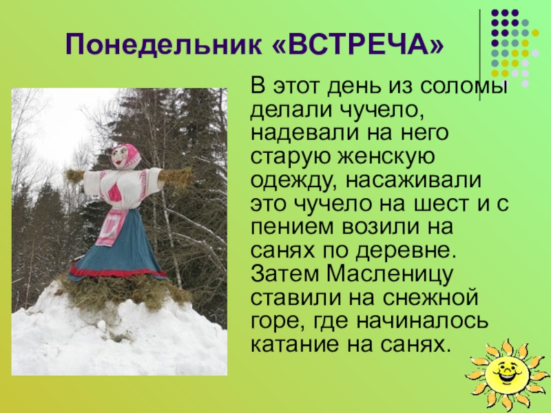 Понедельник «ВСТРЕЧА»В этот день из соломы делали чучело, надевали на него старую женскую одежду, насаживали это чучело
