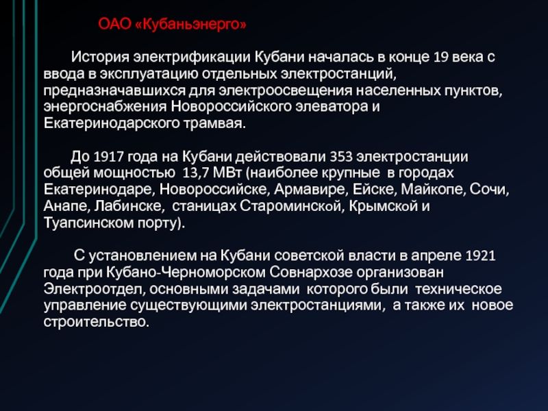 С установлением на Кубани советской власти в апреле 1921 года при Кубано-Черноморском Совнархозе организован Электроотдел, основными задачами которого были техническое управление существующими электростанциями, а также их новое строительство.